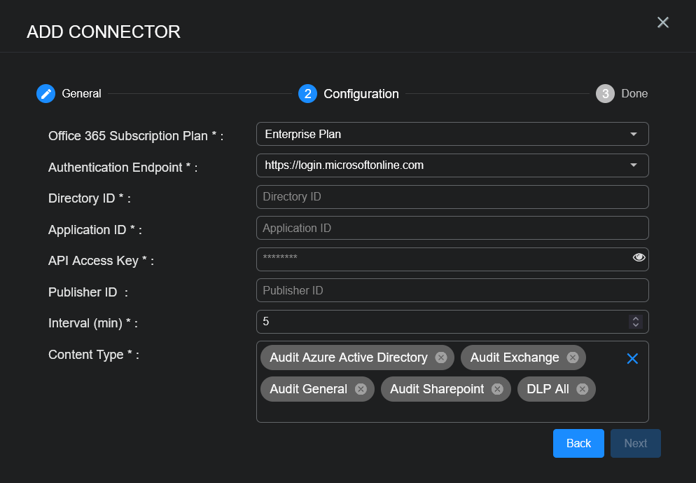 Office 365 Subscription Plan, Authentication Endpoint, Directory ID, Application ID, and API Access Key