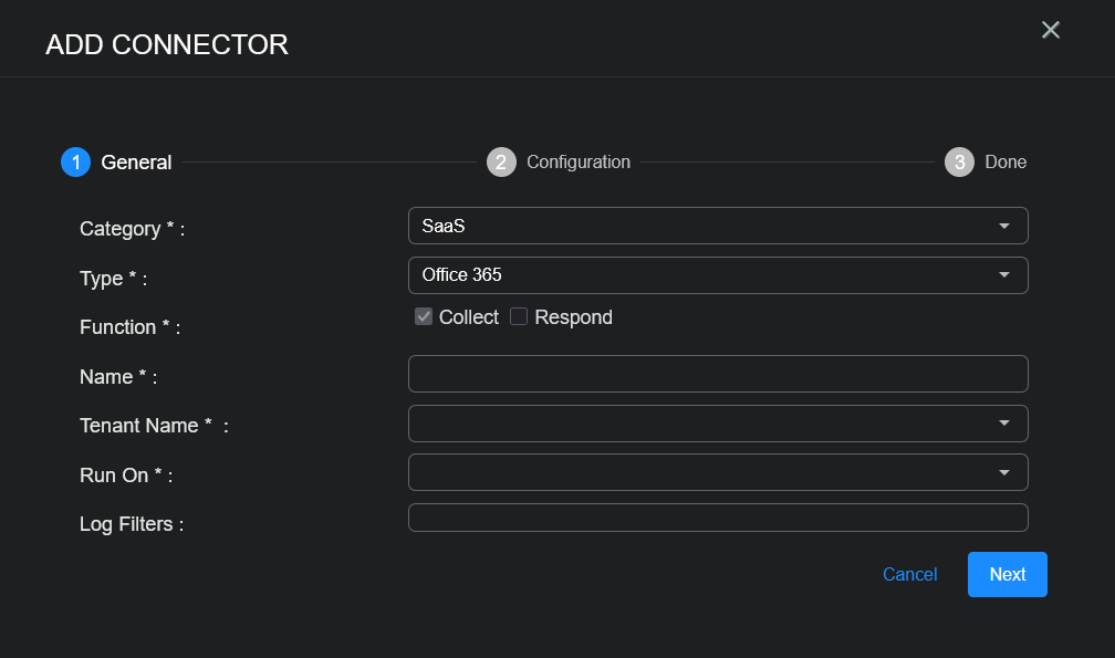 With the audit log enabled, the app registered, and the two IDs and secret handy, add the Office 365 connector in Stellar Cyber: