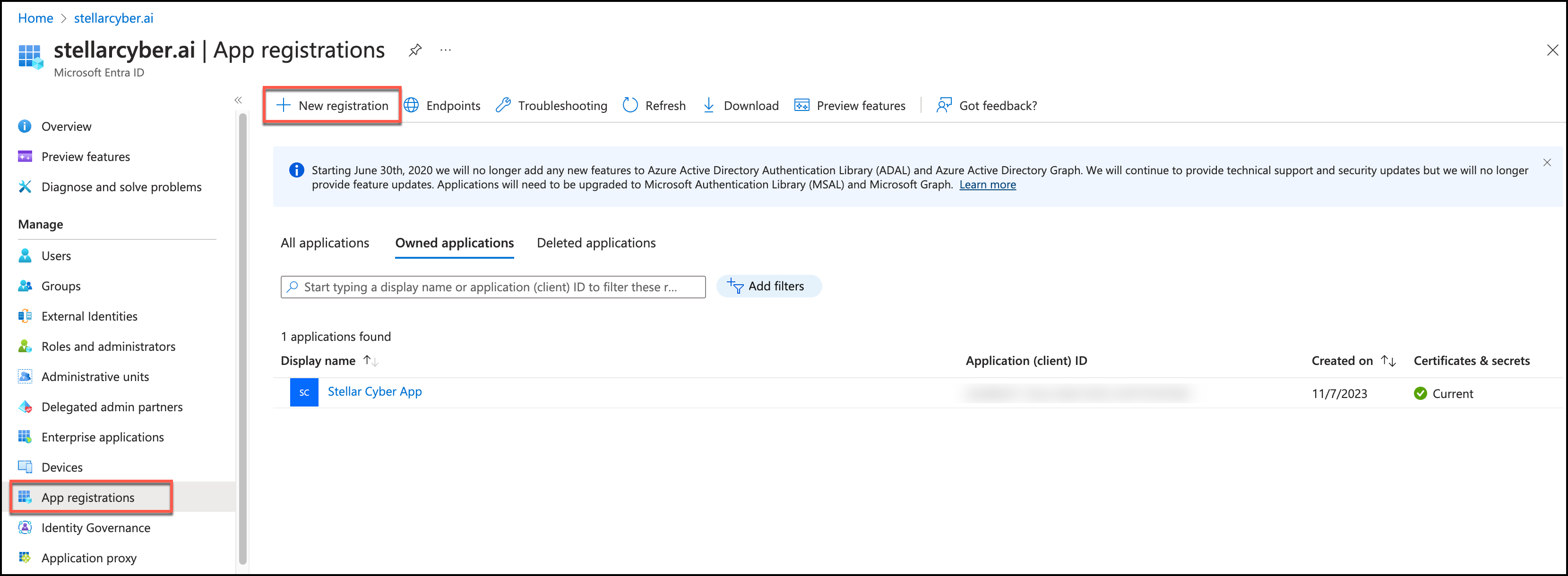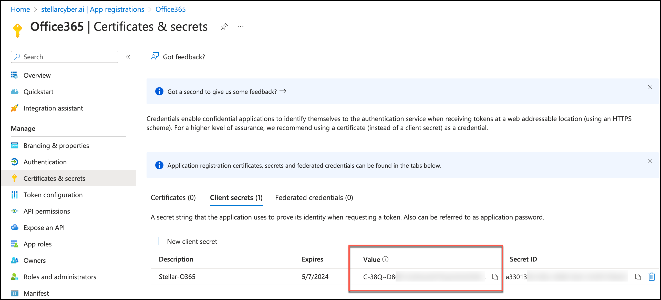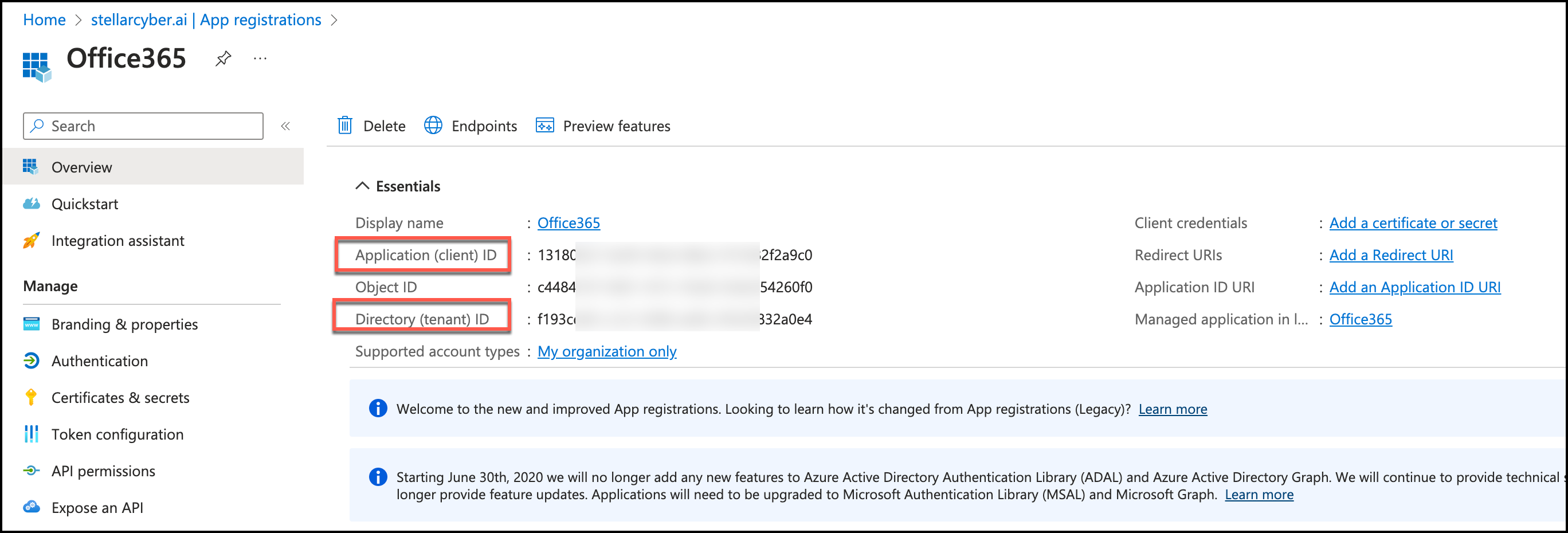 Copy the Application (client) ID and Directory (tenant) ID. You will use them to configure the connector in Stellar Cyber.