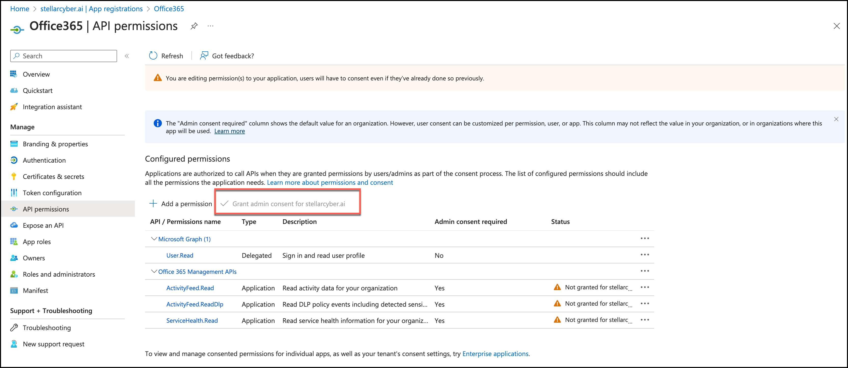 If you are the Office 365 super admin, grant the permissions. Select the checkmark to Grant admin consent for <account name>.