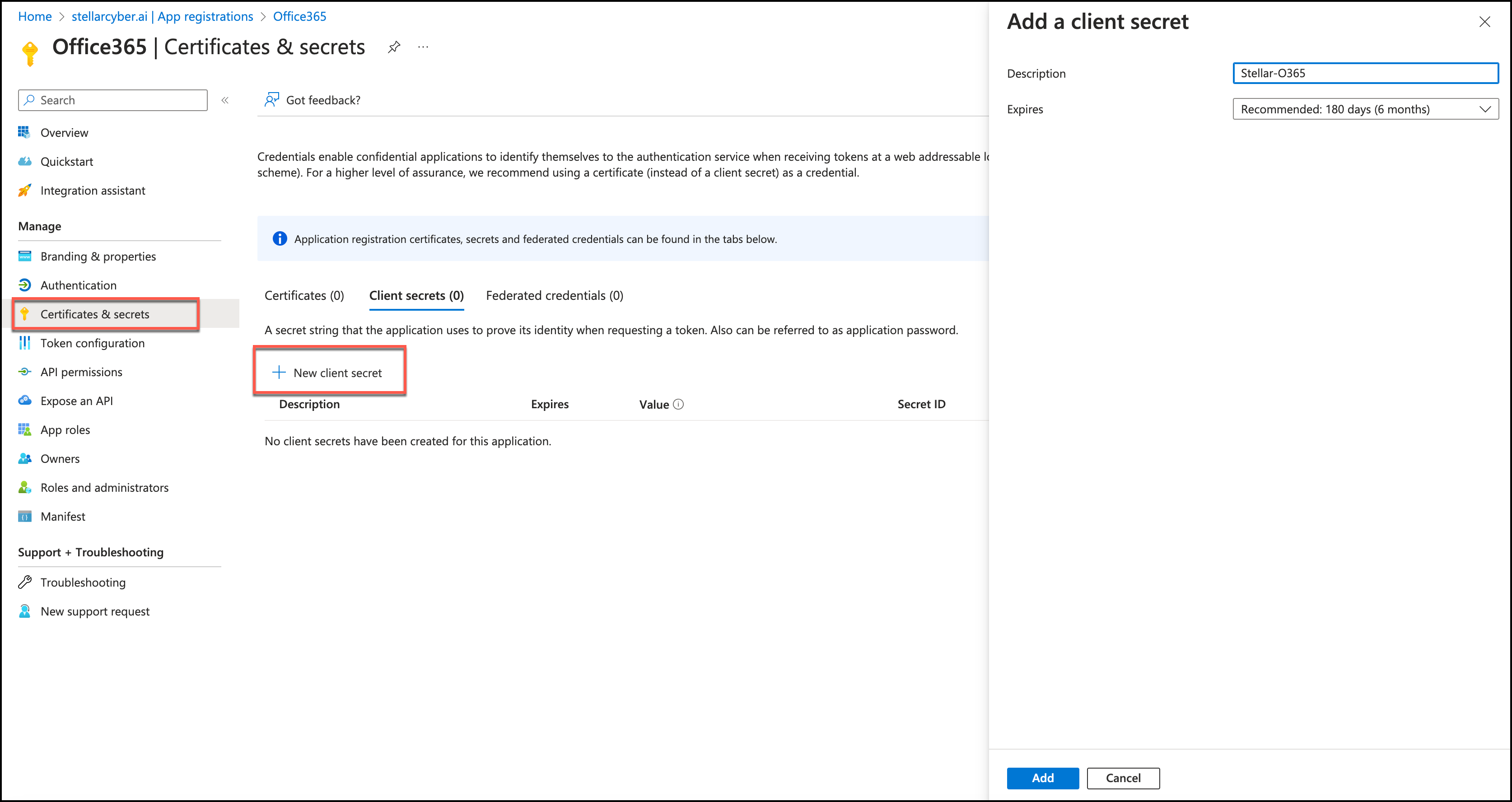 When the permissions are granted, in the navigation pane, click Certificates & secrets.