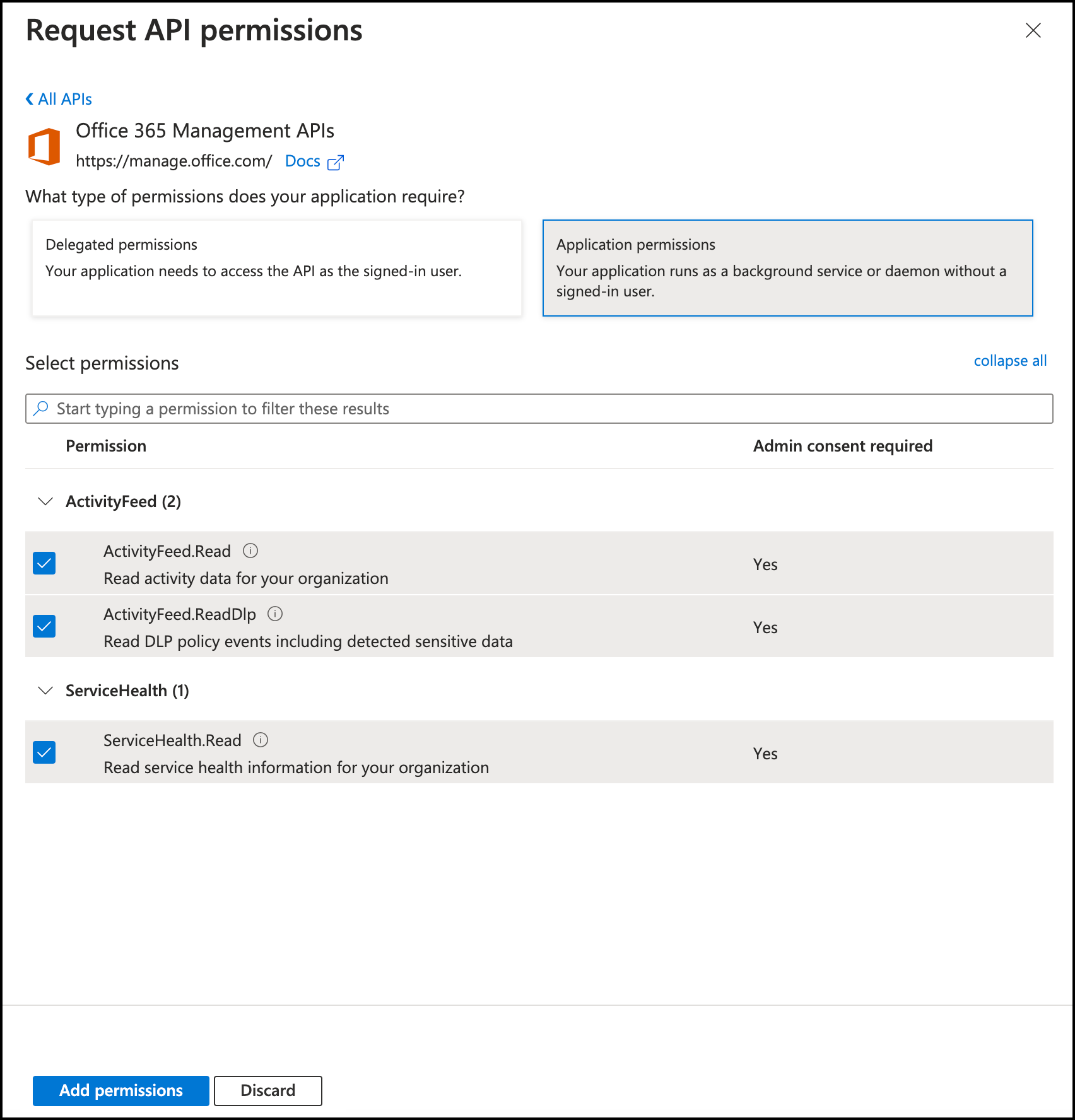Select permissions for ActivityFeed.Read, ActivityFeed.ReadDlp, and ServiceHealth.Read.