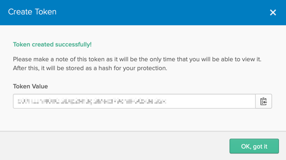 7. Click OK, got it. The API page appears, with your new token listed.