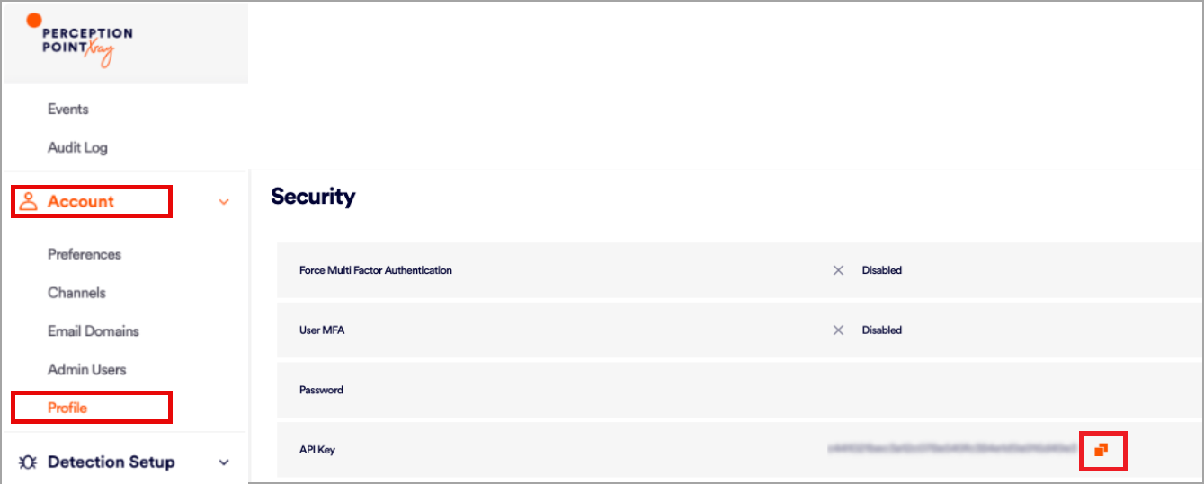 API Token—The authentication credentials. To generate an API Token Key, follow the guidance in the Perception Point API documentation or in Getting the API Token.