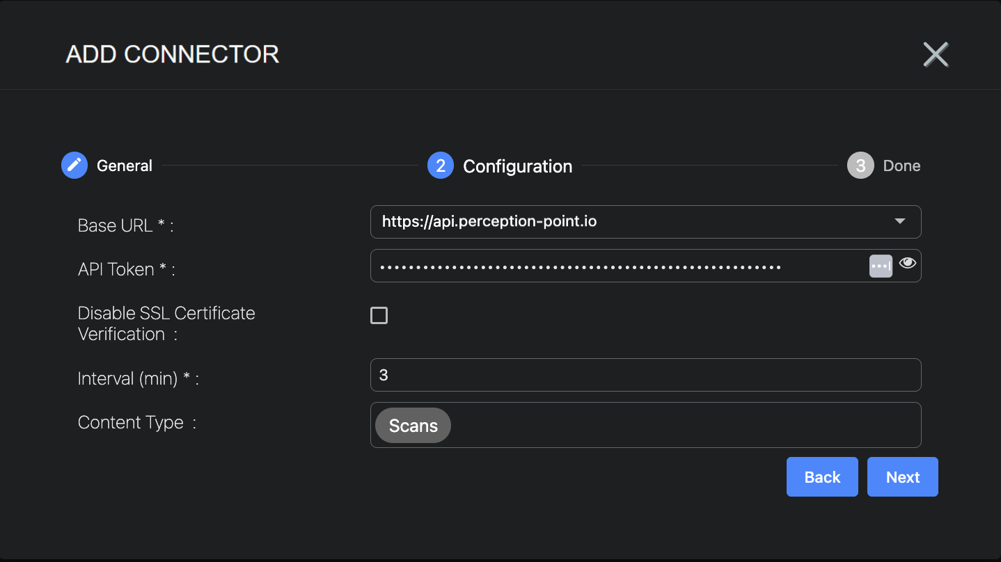 In addition to testing for connectivity, the Test button for the Perception Point X-Ray connector tests that the Base URL and API Token are correct and data requests for the requested content types return successful responses.