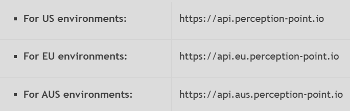 Base URL—The base URL for API access, which you can select from the dropdown menu. The default is https://api.perception-point.io. There are also two other URLs, https://api.eu.perception-point.io and https://api.aus. perception-point.io, as well as Custom URL.