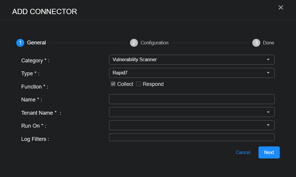 To add a new Rapid7 vulnerability scanner connector in Stellar Cyber: