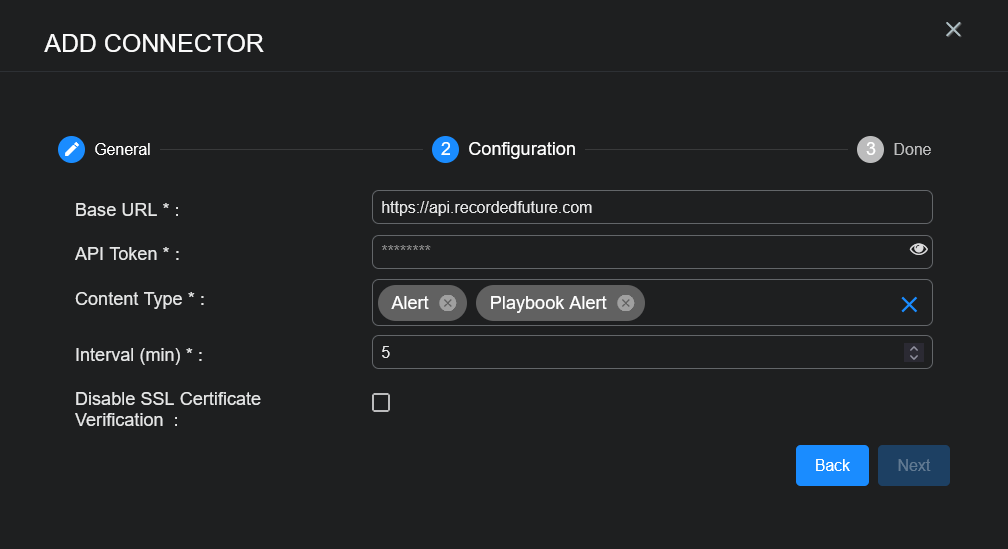 12. Enter the Base URL you noted above in Obtaining Recorded Future Credentials.