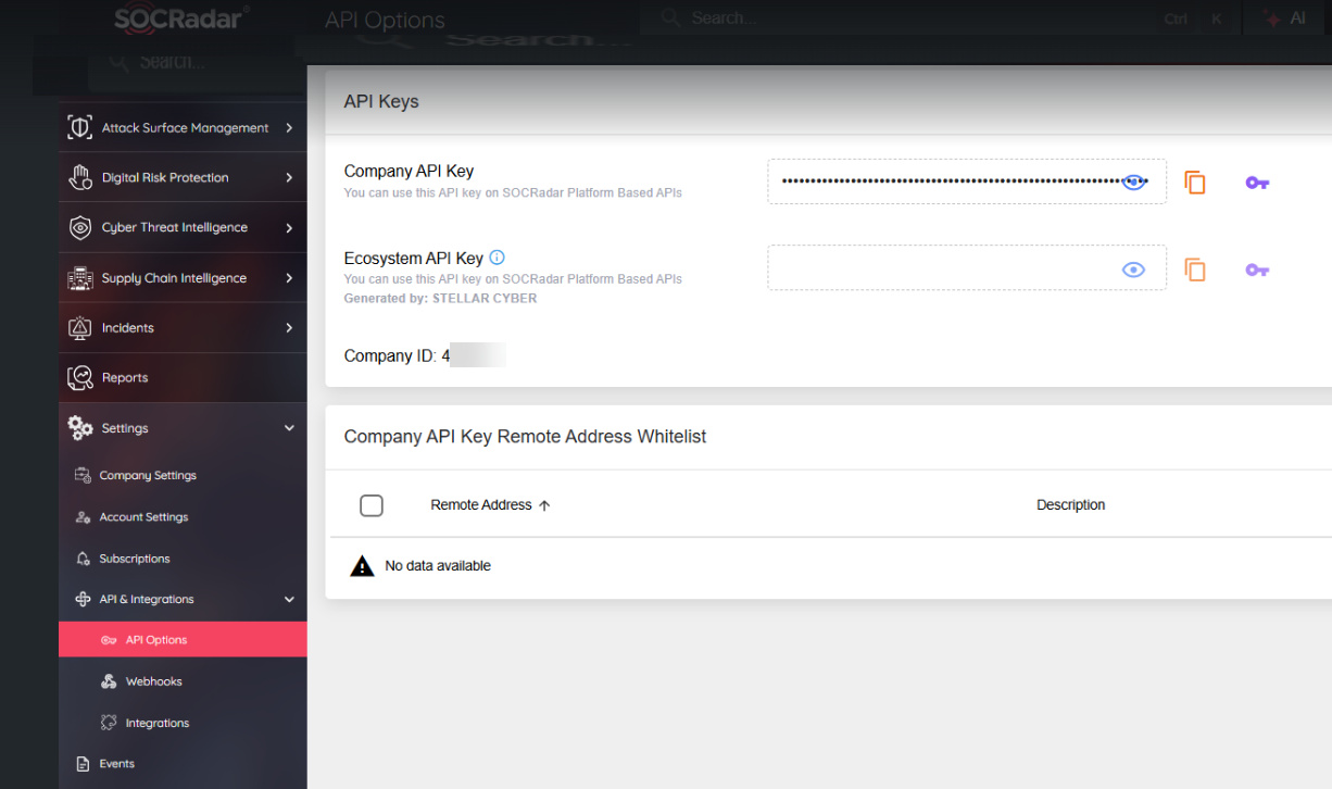 Before you configure the connector in Stellar Cyber, you must obtain the following SOCRadar credentials. Follow the guidance in the SOCRadar documentation (requires login).