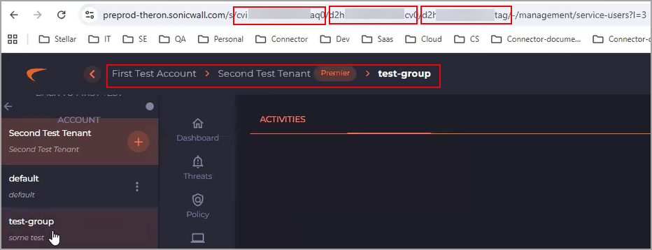 Click the name of a test group. In this example, the group is First Test Account > Second Test Tenant > test-group. The Account ID, Tenant ID, and Group ID are in the URL for the test-group. The scope is <ACCOUNT ID>.<TENANT ID>.<GROUP ID>.
