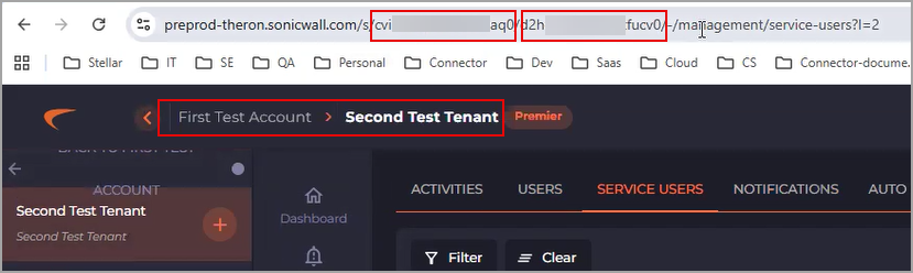 Click First Test Tenant or Second Test Tenant. In this example, the tenant is First Test Account > Second Test Tenant. The Account ID and Tenant ID are in the URL for the Second Test Tenant. The scope is <ACCOUNT_ID>.<TENANT_ID>.