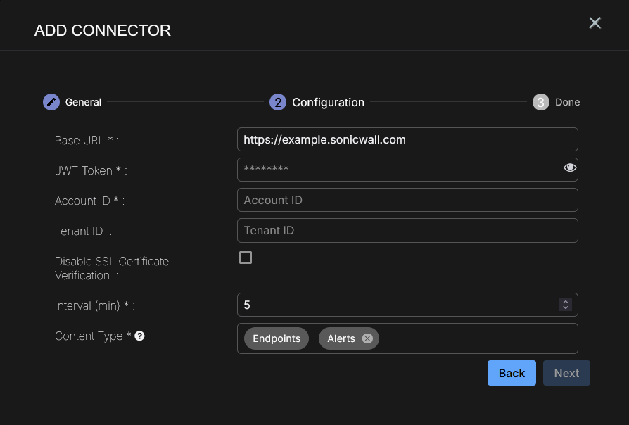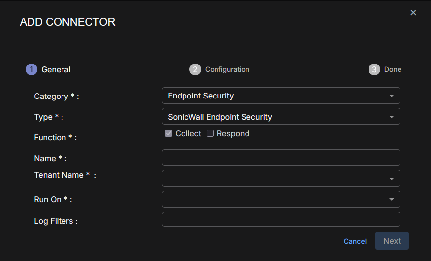 To add a SonicWall Endpoint Security connector in Stellar Cyber: