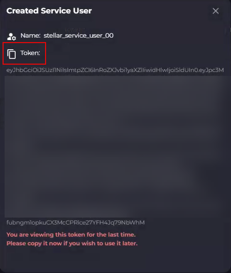 Copy the token displayed in the Created Service User dialog.