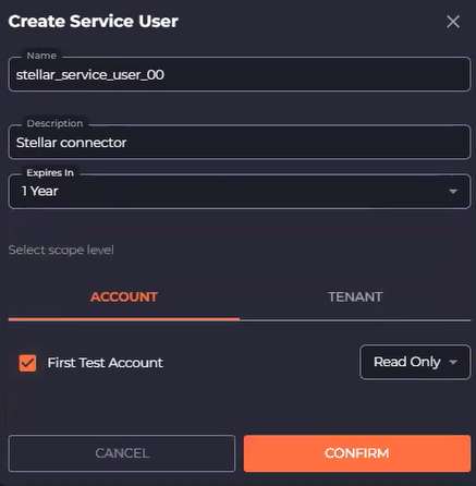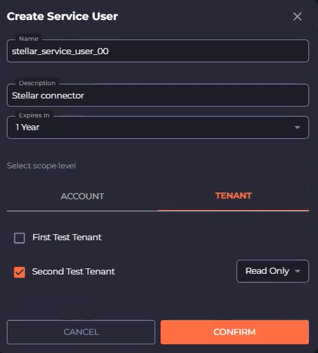 In the Create Service User dialog, enter a name and description, and select an expiry, such as 6 months or 1 year.