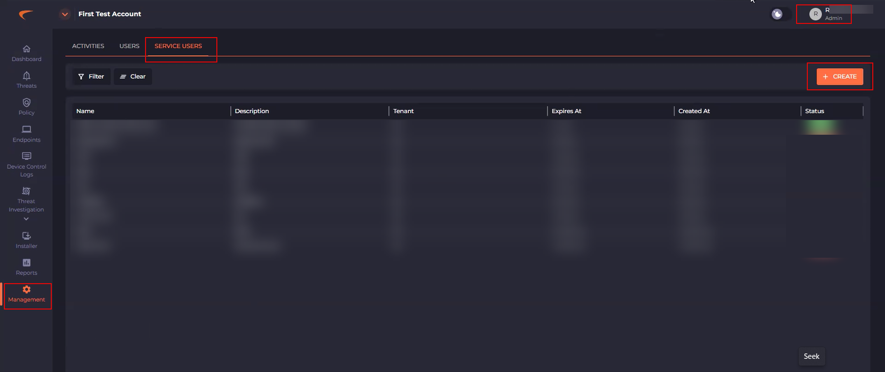 Click Management, click SERVICE USERS, and then click CREATE.