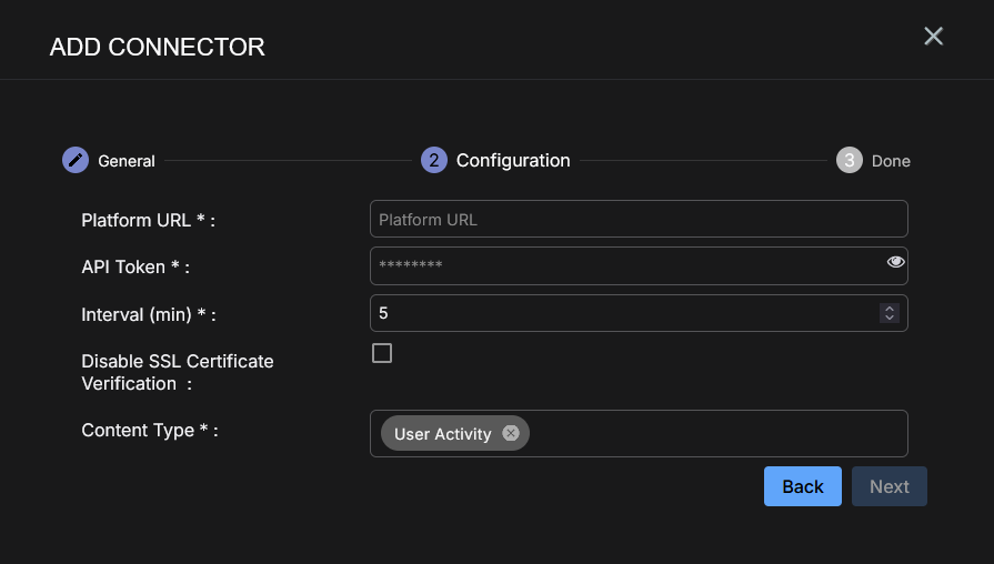 In addition to testing for connectivity, the Test button for the Stellar Cyber connector tests that the Platform URL and API Token are correct and data requests for the requested content type returns successful responses.