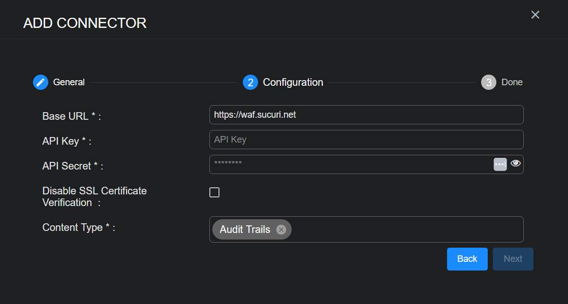 In addition to testing for connectivity, the Test button for the Sucuri Security connector tests that the Base URL and API Key/API Secret are correct and data requests for the requested content type return successful responses.
