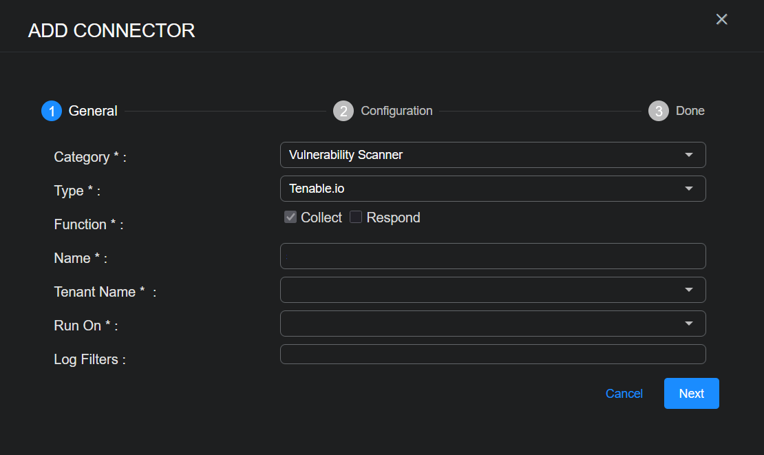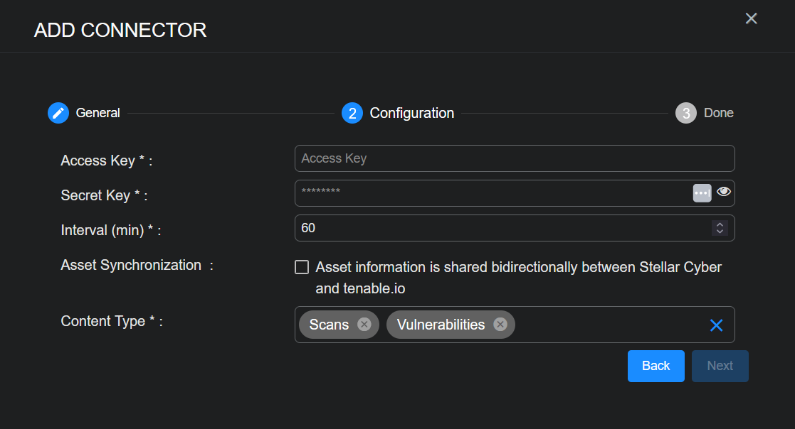 To add a new Tenable.io vulnerability scanner connector in Stellar Cyber: