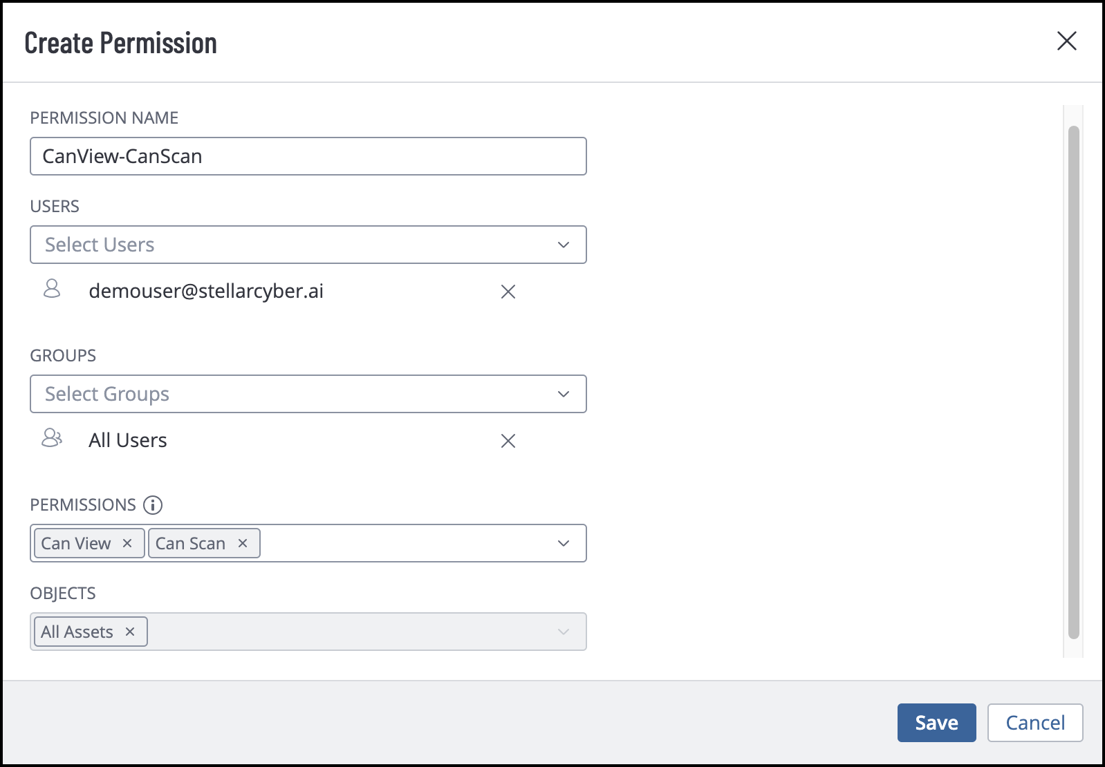 • Add that user to a group with the following permissions: Can View and Can Scan, and the following access object: All Assets.