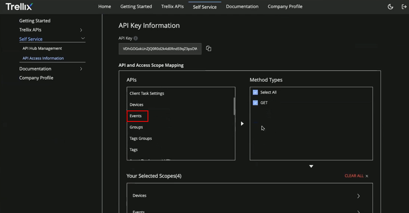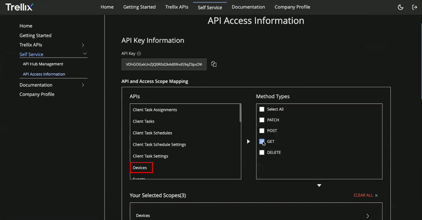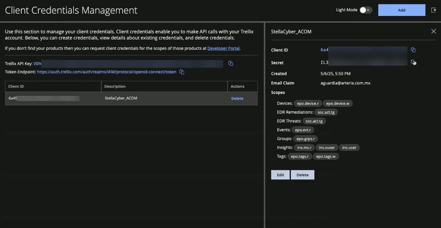 Copy the Client ID and Secret and store them in a safe location. Also copy the Trellix API Key. These credentials are used in the configuration of the Trellix MVISION connector.