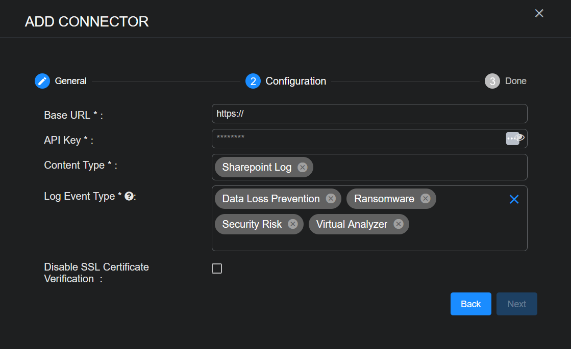 Choose the Log Event Type you would like to collect. This is the event type for ingesting logs data. The event types for Data Loss Prevention, Ransomware, Security Risk, and Virtual Analyzer are supported.