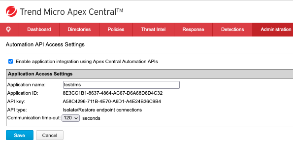 Ensure that the checkbox for Enable application integration using Apex Central Automation APIs is selected.