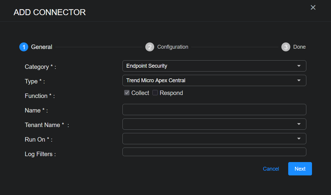 This topic refers to configuring a Trend Micro Apex Central connector. Also see: