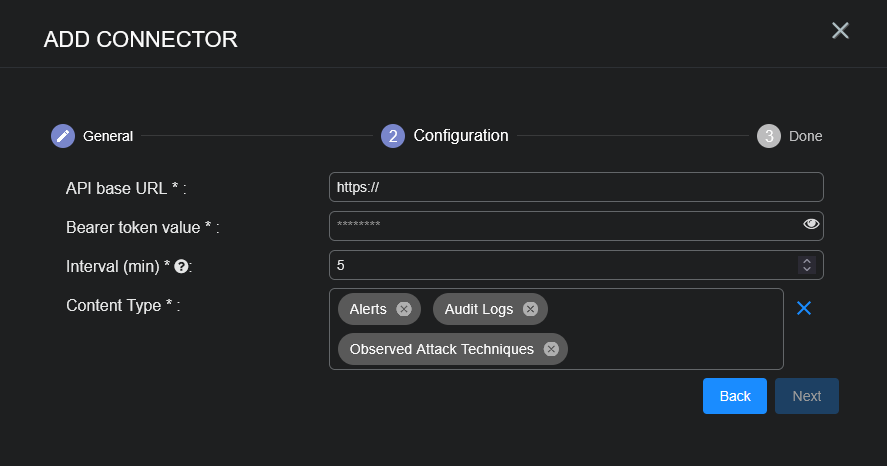 Choose the Content Type you would like to collect. The logs for Alerts, Audit Logs, and Observed Attack Techniques are supported.