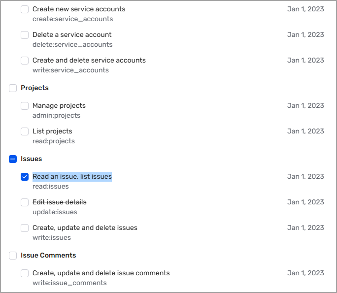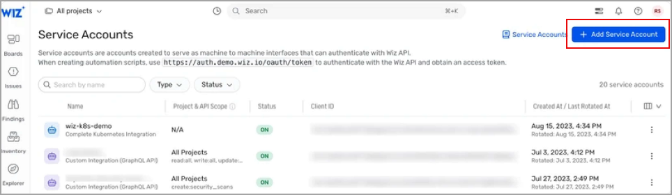 Add a service account for authenticating with the Wiz API. You will need to specify the permissions (API scopes).