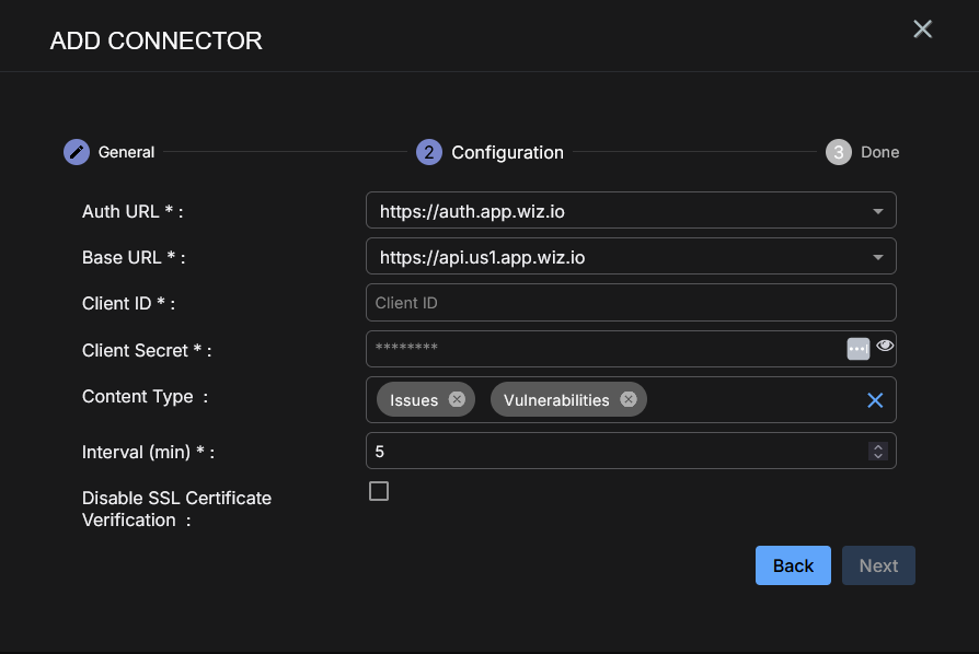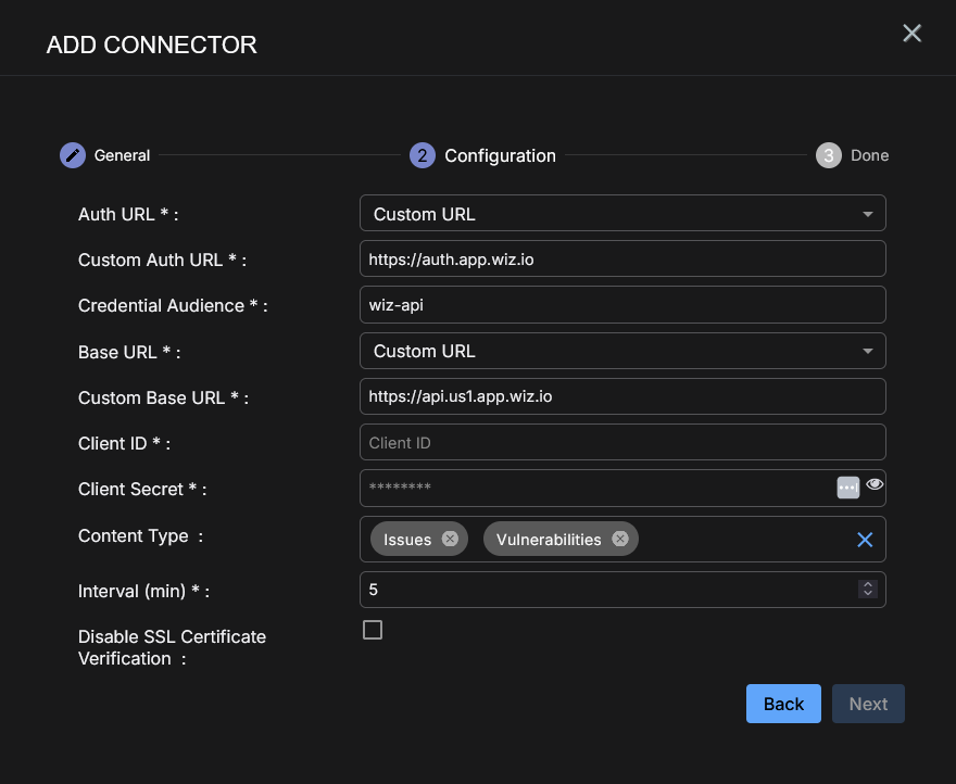 Custom Base URL—The default is https://api.us1.app.wiz.io