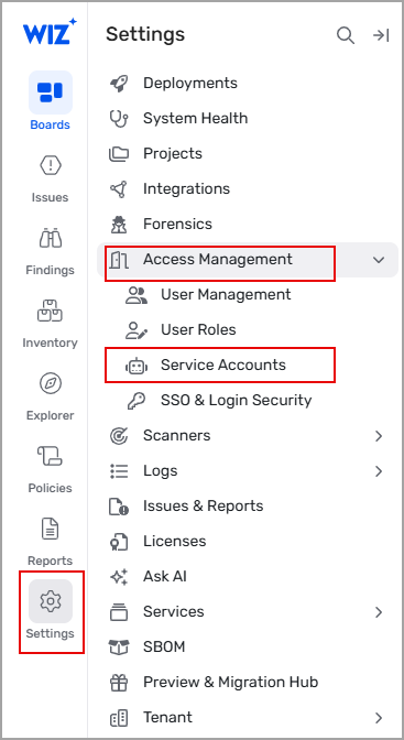 Log in as a Wiz administrative user with Write permission for Service Accounts.