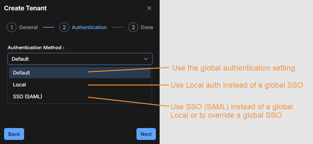 A Global selection of Authentication and Authorization applies to all users (root, partner, and tenant), so the option to change authentication method for a specific tenant is not applicable when the Global method is set to Authentication and Authorization. You cannot log in to Tenant SSO when Global SSO is set to Authentication and Authorization. If you want to use SSO but also allow local users and tenant override, you must set the Global authentication method either to Local or to use the IdP with Authentication Only.