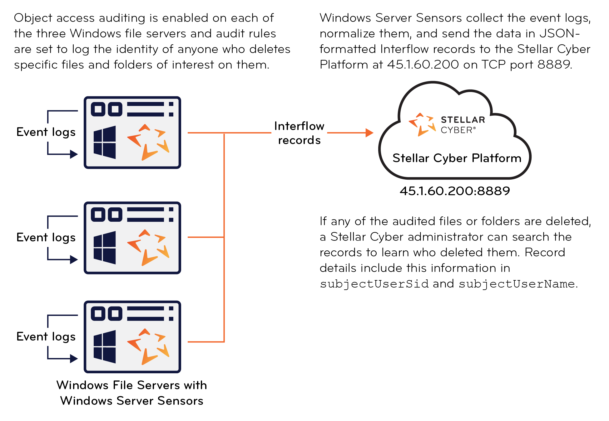 If you configure the following settings on a Windows file server with a Windows Server Sensor, Stellar Cyber can quickly identify any users who make unauthorized file and folder deletions: