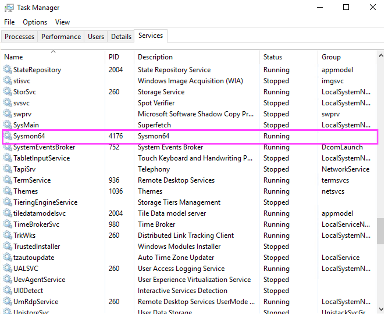 Open the Task Manager (Ctrl-Alt-Del -> Task Manager) and verify that the Sysmon64 service appears in the list.