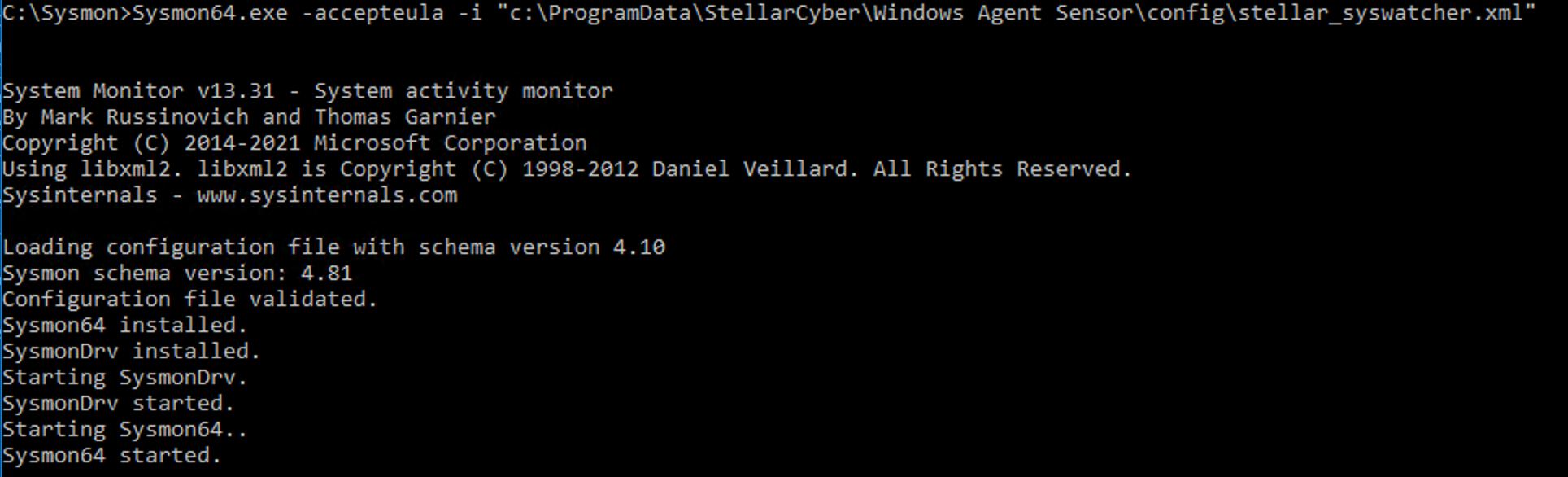 Sysmon64.exe -accepteula -i "c:\ProgramData\StellarCyber\Windows Agent Sensor\config\stellar_syswatcher.xml"