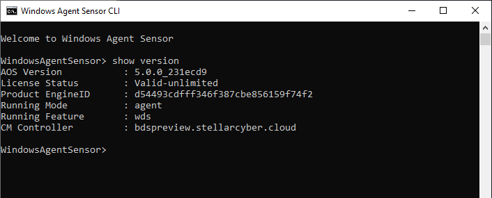 After starting the Windows Server Sensor CLI, a terminal window appears as below. This window lets you enter CLI commands to the Server Sensor. Enter the show version command to verify the sensor's operations. In response, the sensor displays output similar to the following: