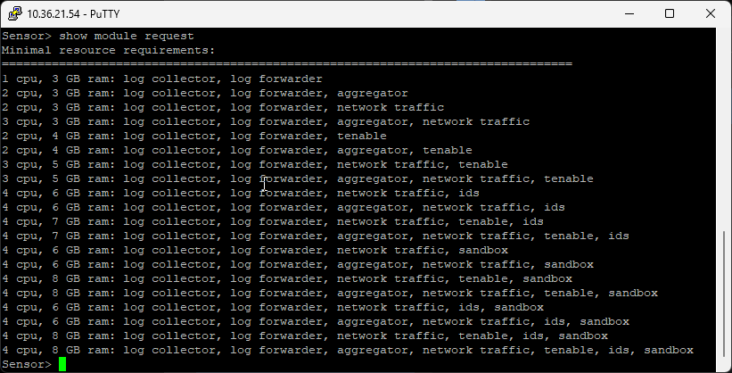• The resources in the table were current at the time of writing. You can always see the most recent recommendations from Stellar Cyber by using the show module request command in the Sensor CLI. For example: