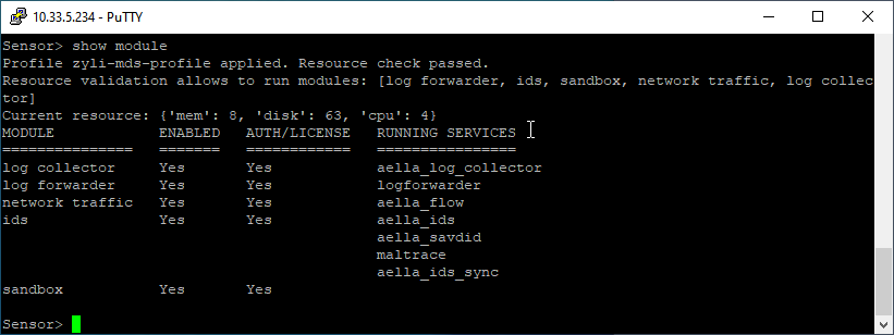When you apply a Modular Sensor Profile, Stellar Cyber automatically checks the CPUs and RAM provisioned for the target sensor and informs you whether they are sufficient to support the features enabled in the profile. You can also see the results in the show module command listed above – the output of the command reports both the name of the Modular Sensor Profile applied and whether the resource checks passed.