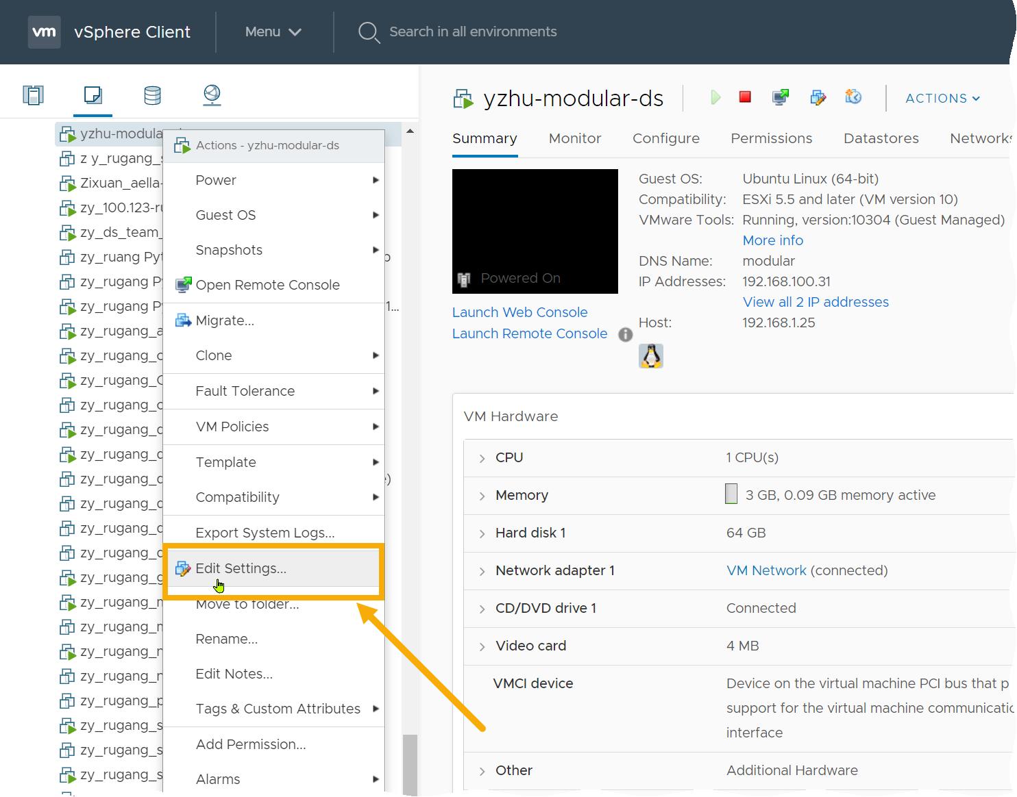 3. Right-click the VM for the Stellar Cyber sensor whose resources you want to reserve and choose Edit Settings from the menu that appears.