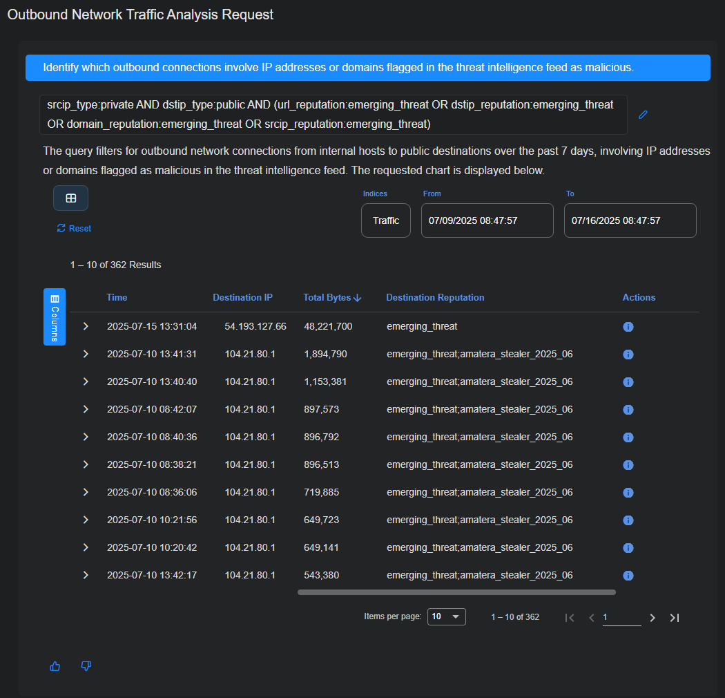 If you need to verify whether new suspicious traffic has appeared since your initial investigation, you can use the Reset button above the query results. This option reruns the same investigation query with your previous parameters but starting from the present moment so that you see the most current data without needing to retype the prompt.