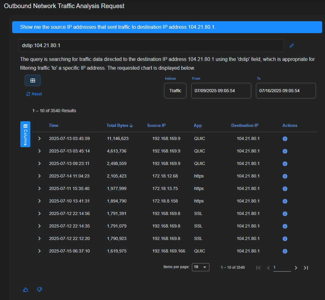 Use AI Investigator to filter through the outbound traffic sessions and display only those with destinations flagged as malicious. Next you can either expand rows or add columns like Destination IP to find the IP addresses of these malicious destinations, which you then use in subsequent prompts to find which devices initiated the connections.