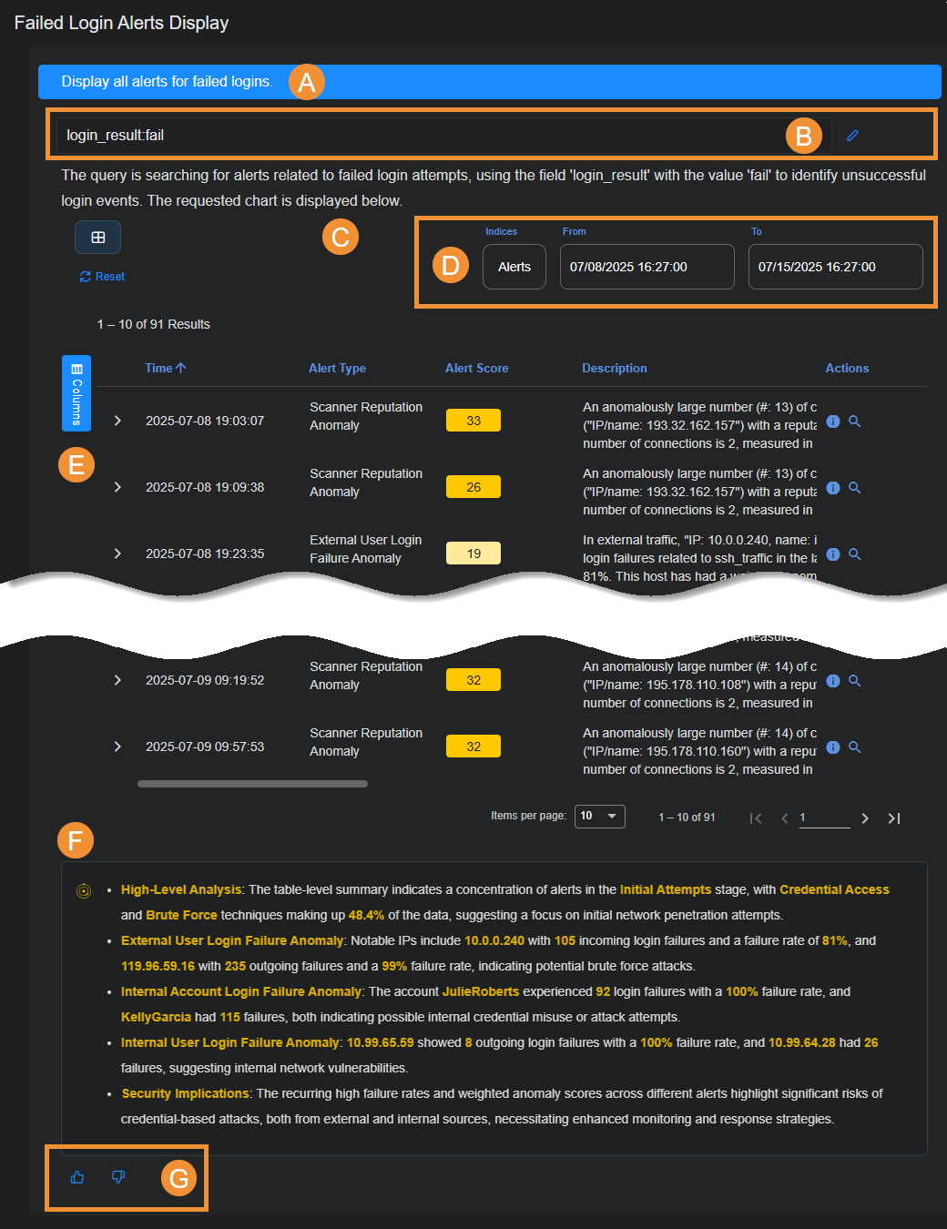 AI Investigator provides an interactive table or chart displaying the results The following screen capture shows the response to a prompt to display all alerts for login failures. Here are explanations of the different components of the response: