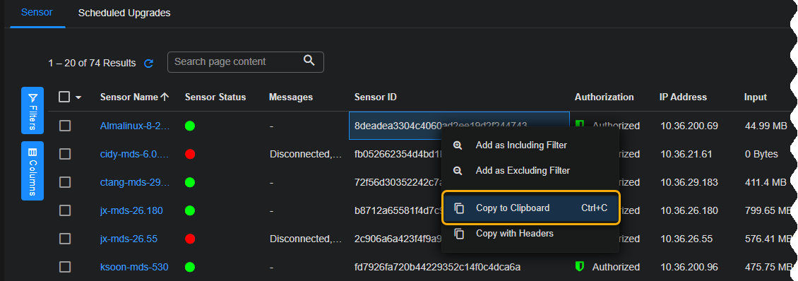 Right-click the entry in the Sensor ID column and use the Copy to Clipboard command in the context menu that appears to copy the Sensor ID. For example: