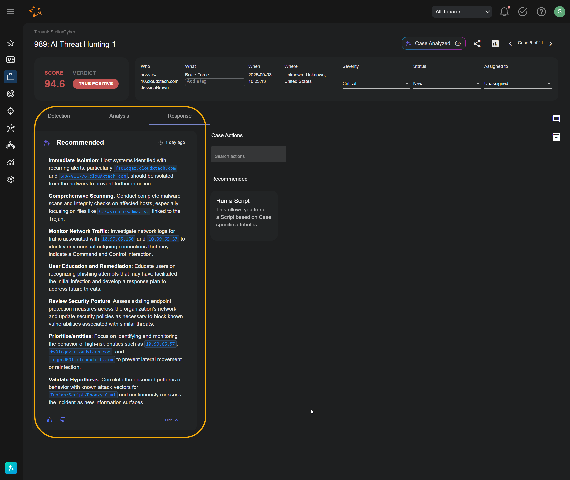 After running AI Case Analysis on a case, the Response tab in the Case Detail view provides case-specific guidance for containment and investigation. As shown in the figure below, this guidance helps you move quickly from analysis to action with recommendations tailored to the specific case: