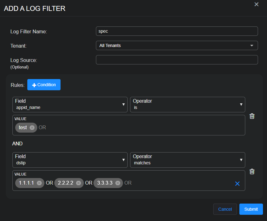 • You can define multiple filter rules with different field names and field values. The maximum number of Conditions (rules) per log filter is 10.