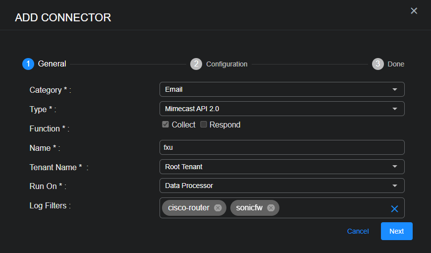 When the Function is Collect, you can apply log filters to a connector. The configuration page does not display the Log Filters field if the Function is only Respond.