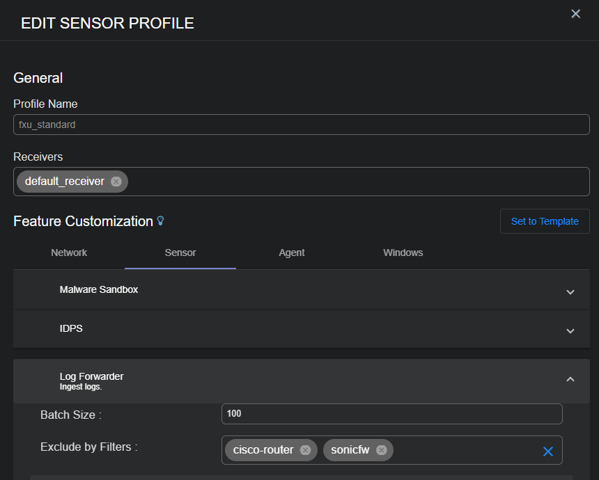 You can apply a log filter to the Log Forwarder in both the Standard Sensor Profile and Modular Sensor Profile pages (System | DATA SOURCE MANAGEMENT | Sensors | Sensor Profiles).