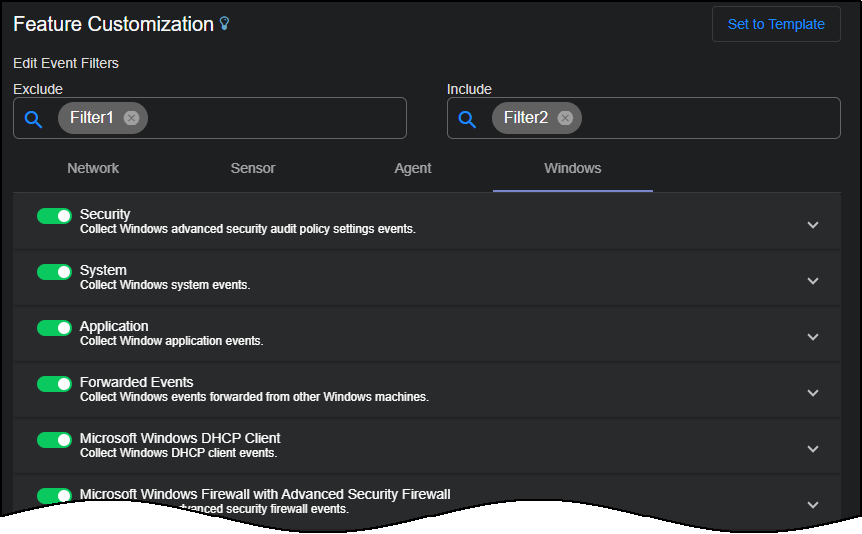 You can apply a log filter to Windows Events in the Windows tab of the Standard Sensor Profile page.