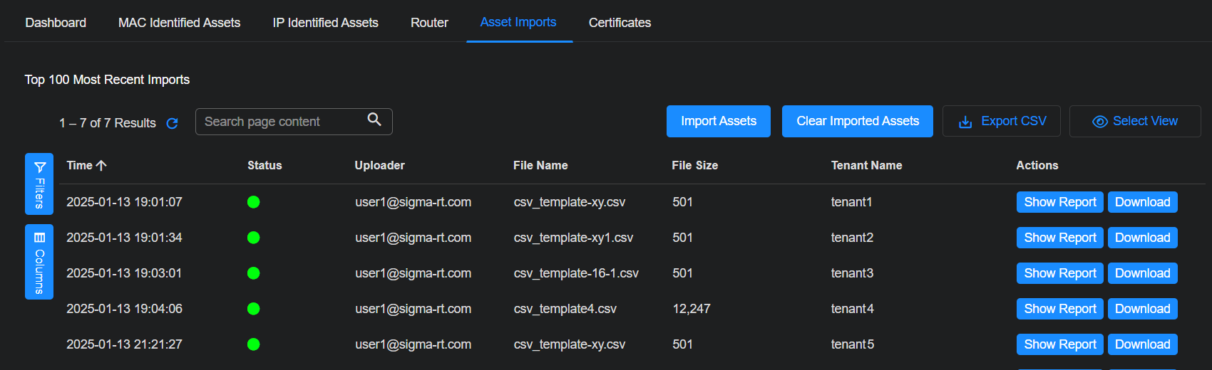 Stellar Cyber checks the file to make sure the hostname, ip, and mac fields are included and that no reserved fields (such as vlan, risk_score, and vuln_score) were added. If the file is valid, the Import button activates.