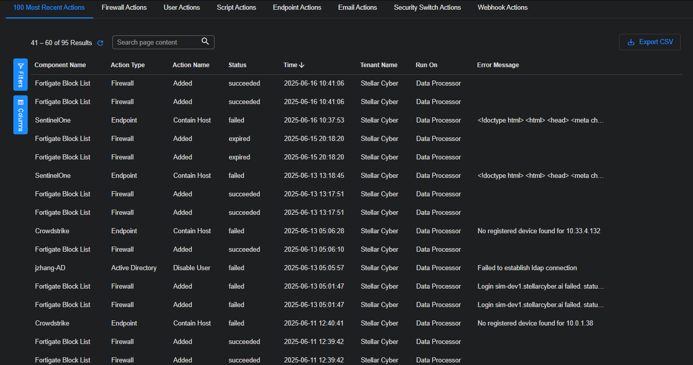 The default view of this page displays the most recent actions. It also includes tabs for actions by Stellar Cyber for the following types: